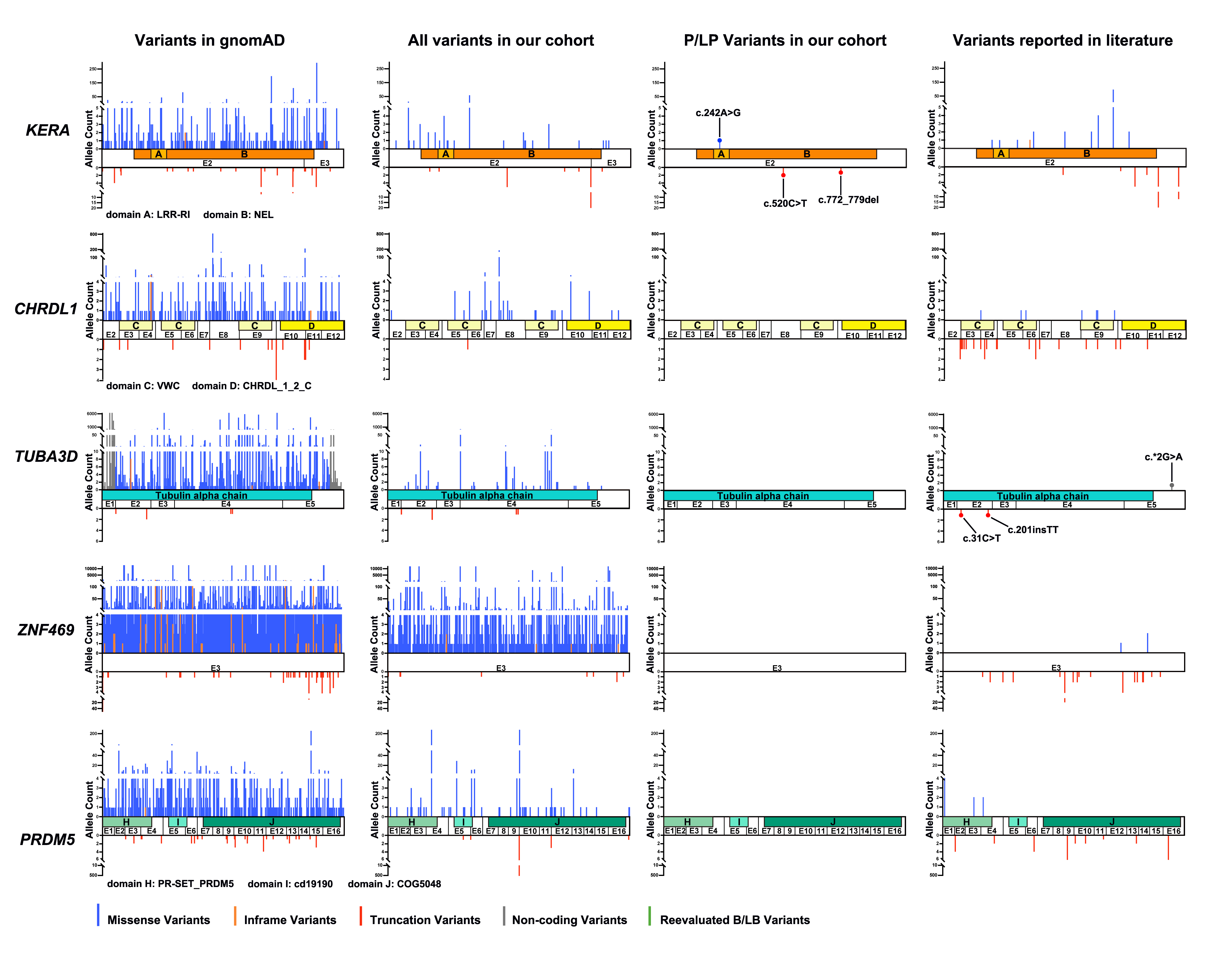 Figure 2. Distribution and frequency of variants in KERA, CHRDL1, VSX1, TUBA3D, ZNF469 and PRDM5 in our gnomAD and our cohort, pathogenic/likely pathogenic (P/LP) variants in our cohort, and variants reported in literature.
