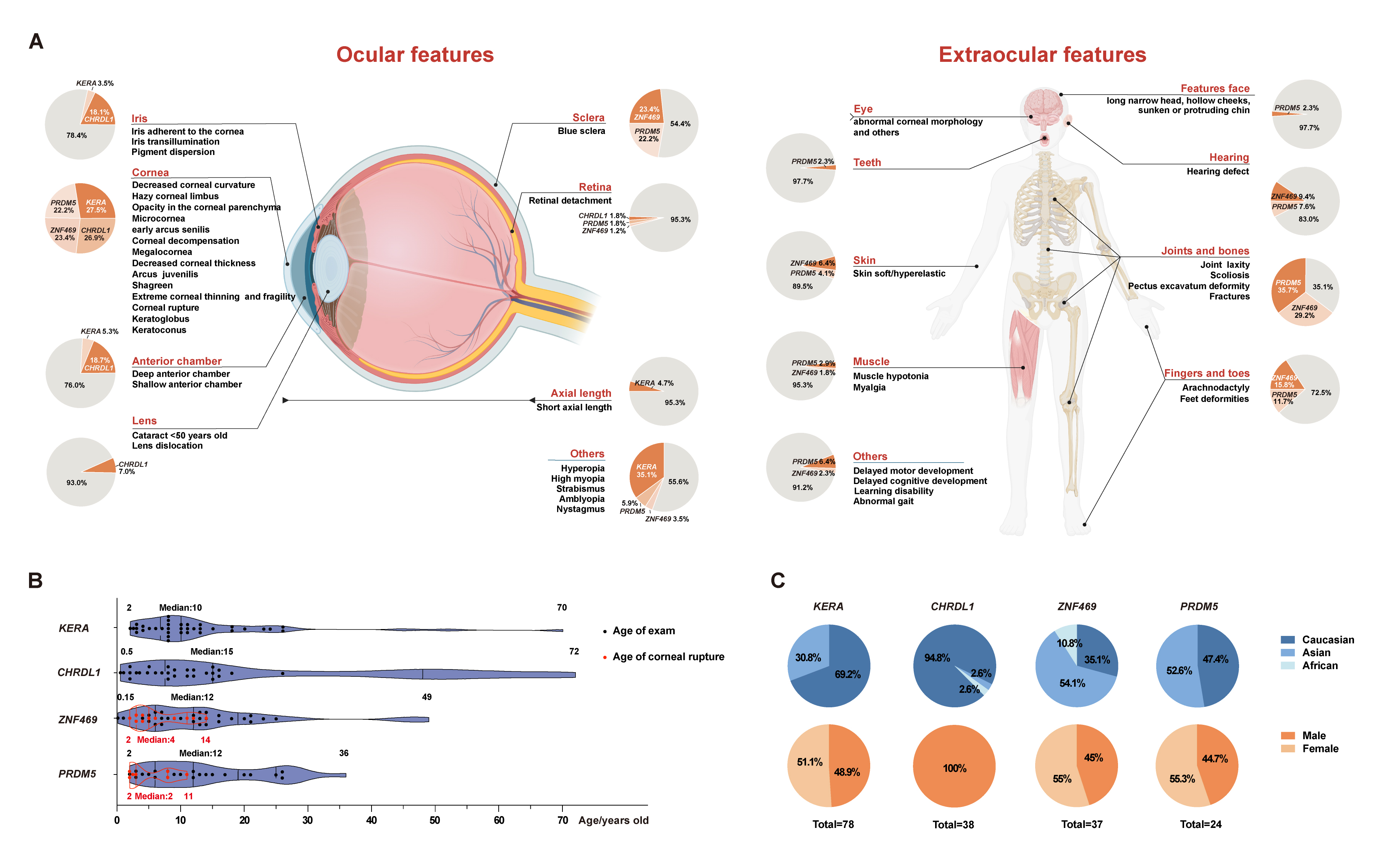 chart, the gray section represents the proportion of families carrying pathogenic variants in KERA, CHRDL1, ZNF469 and PRDM5 that do not exhibit the phenotype, relative to all families carrying pathogenic variants in KERA, CHRDL1, ZNF469 and PRDM5. The image was created by Biorender and Adobe illustrator. B: Age of exam and age of corneal rupture of KERA, CHRDL1, ZNF469 and PRDM5; (C) Race and sex of KERA, CHRDL1, ZNF469 and PRDM5.