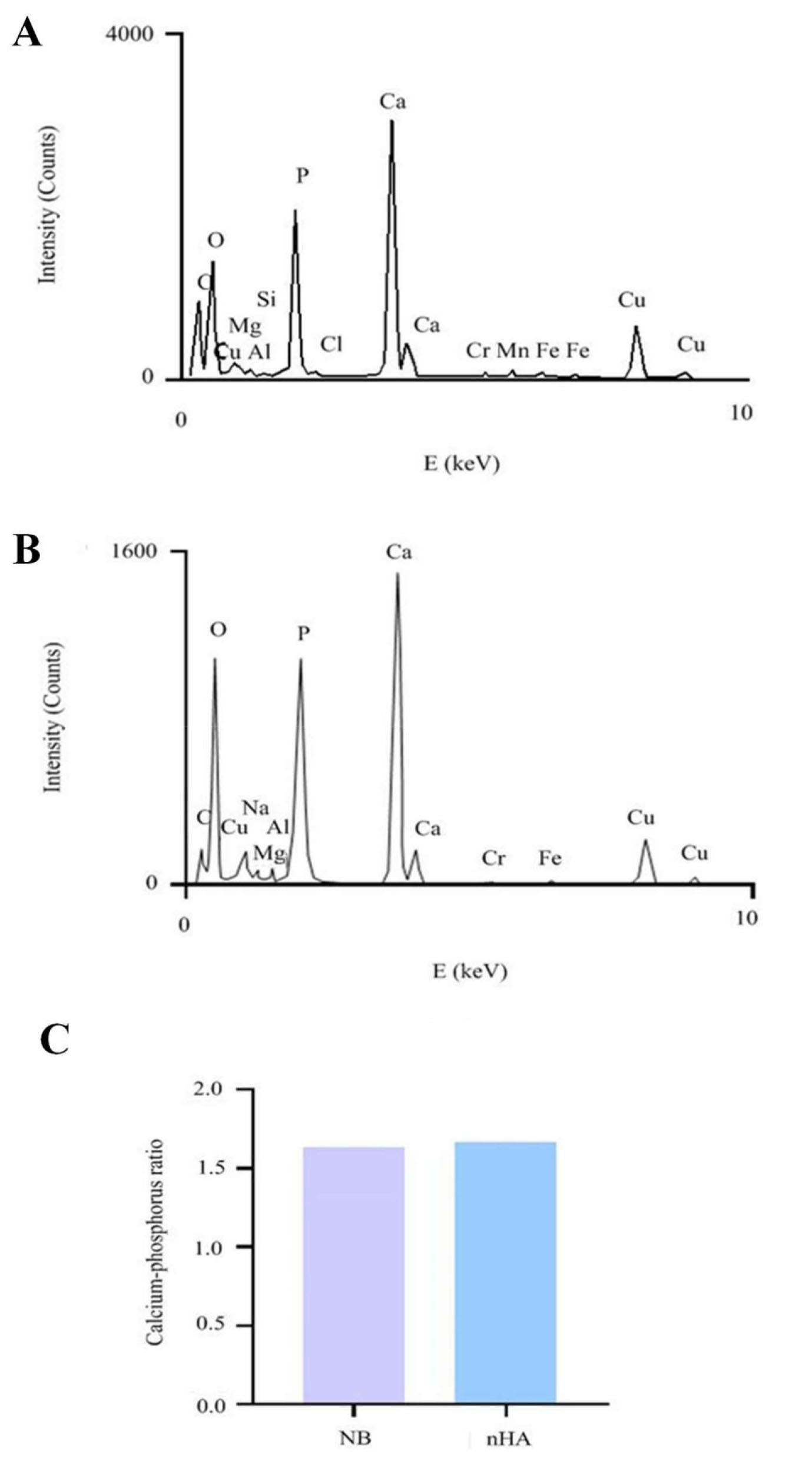 Energy-dispersive X-ray spectroscopy (EDX) analysis of nanobacteria and nanohydroxyapatite.