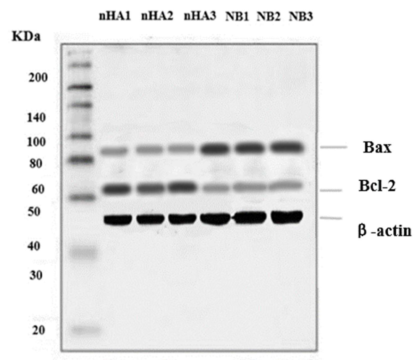 Protein bands of Bcl-2 and Bax detected by western blot.