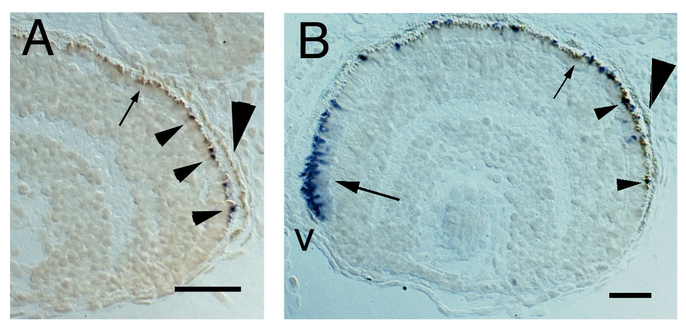 Figure 5. Double in situ hybridization of embryonic zebrafish (80 hpf) cryosections