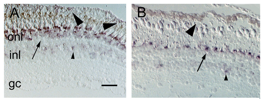 (A) Light-adapted retina, both rods and cones are labeled (arrow), as are scattered cells in the INL (small arrowhead). The basal region of the lightly-pigmented RPE is also labeled (large arrowheads); scale bar = 50 µm. (B) Dark-adapted retina, a subset of cones is labeled (arrow), as are some cells in the INL (small arrowhead). The dark-adapted RPE shows a distribution of pigmentation (large arrowhead) that may obscure labeling, making it difficult to discern whether this tissue is expressing IRBP mRNA.