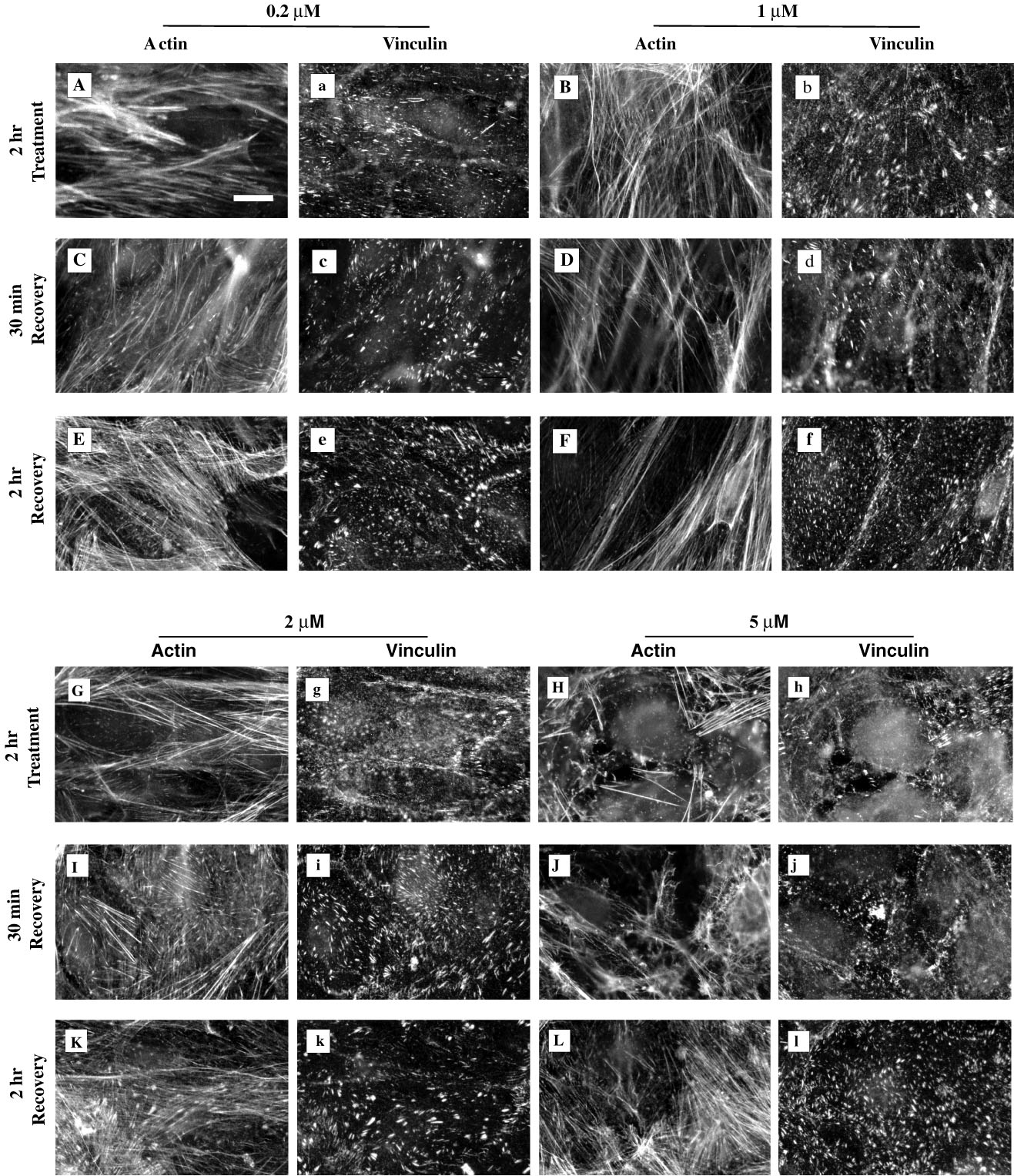 Recovery of actin-based and vinculin-containing focal adhesions in cultured HTM cells after treatment with 0.2, 1, 2, or 5 mM LAT-A for 2 h, and recovery for 30 min or 2 h in LAT-A-free medium. Recovery of the actin-based cytoskeleton (panels C, D, I, and J) and vinculin-containing focal adhesions (panels c, d, i, and j) after 2 h exposure to LAT-A was apparent by 30 min. Recovery was more complete following treatment with lower doses of LAT-A and longer recovery times (panels E, F, e, and f). Bar = 20 mm.