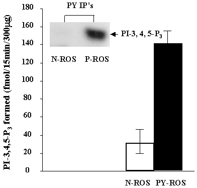 Anti-PY immunoprecipitates from PY-ROS and N-ROS (300 mg protein each) were assayed for PI 3-kinase activity with [g-32P]ATP using PI-4,5-P2 as a substrate. The [32P]-labeled phospholipids were separated on TLC and visualized by autoradiography (inset). PI-3,4,5-P3 spots were scraped and counted for radioactivity. Values are mean and standard deviation for five independent ROS preparations (p<0.0002).