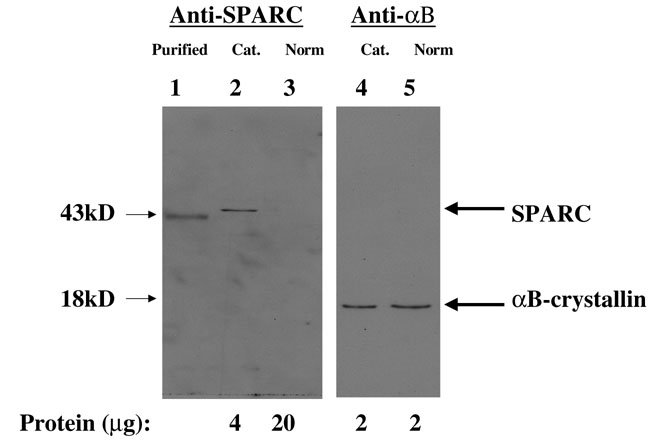 Extracts were prepared and polypeptides were separated and blotted as described in Materials and Methods. Shown is the autoradiogram of the corresponding blot. Lane 1 contains purified osteonectin/SPARC, lane 2 contains cataractous lens extract (cat), and lane 3 contains normal lens extract (norm) probed with anti-SPARC antibody. Lane 4 contains cataractous lens extract (cat) and lane 5 contains normal lens extract (norm) probed with anti-aB-crystallin antibody. Also shown are the osteonectin/SPARC and the aB-crystallin bands with their corresponding molecular weights. The protein added to each well is shown below the blot.