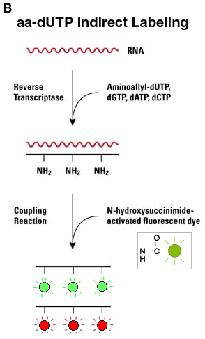 Schematic representations of experimental procedures. A: Direct labeling. B: Aminallyl indirect labeling. C: Genisphere 3DNA labeling.