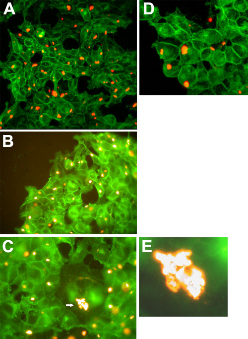The MP19greenTO cell line was seeded onto coverslips and cotransfected with MP19To3-pDsRed2-N1, which expressed MP19To3 fused to the red fluorescent protein, DsRed. After 48 h following transfection with MP19To3pDsRed2-N1, the cells were induced with tetracycline and observed for fluorescence 24 h later. A: Analysis of MP19green and MP19To3red coexpression in 293 cells, using confocal microscopy with both the EGFP and DsRed filter sets. The image was obtained using the inverted microscope with a 40x water objective. B: Analysis of MP19green and MP19To3red coexpression in 293 cells, using Epi-fl microscopy (EGFP and DsRed filter sets). The image was obtained using a Nikon Optiphot-2 upright microscope with the episcopic-fluorescence attachment EFD-3. Cells were observed using a 40x oil objective. C: Conditions were identical with those in B, view of a different area of the coverslip and the image was magnified 2-fold. Note the "giant" cell in the center of the image, with a very large inclusion of MP19To3red protein (arrow). D: Conditions were identical with those in A, view of a different area of the coverslip and the image was magnified 3-fold. E: Magnified view of the very large inclusion body containing MP19To3red protein observed in C, arrow.