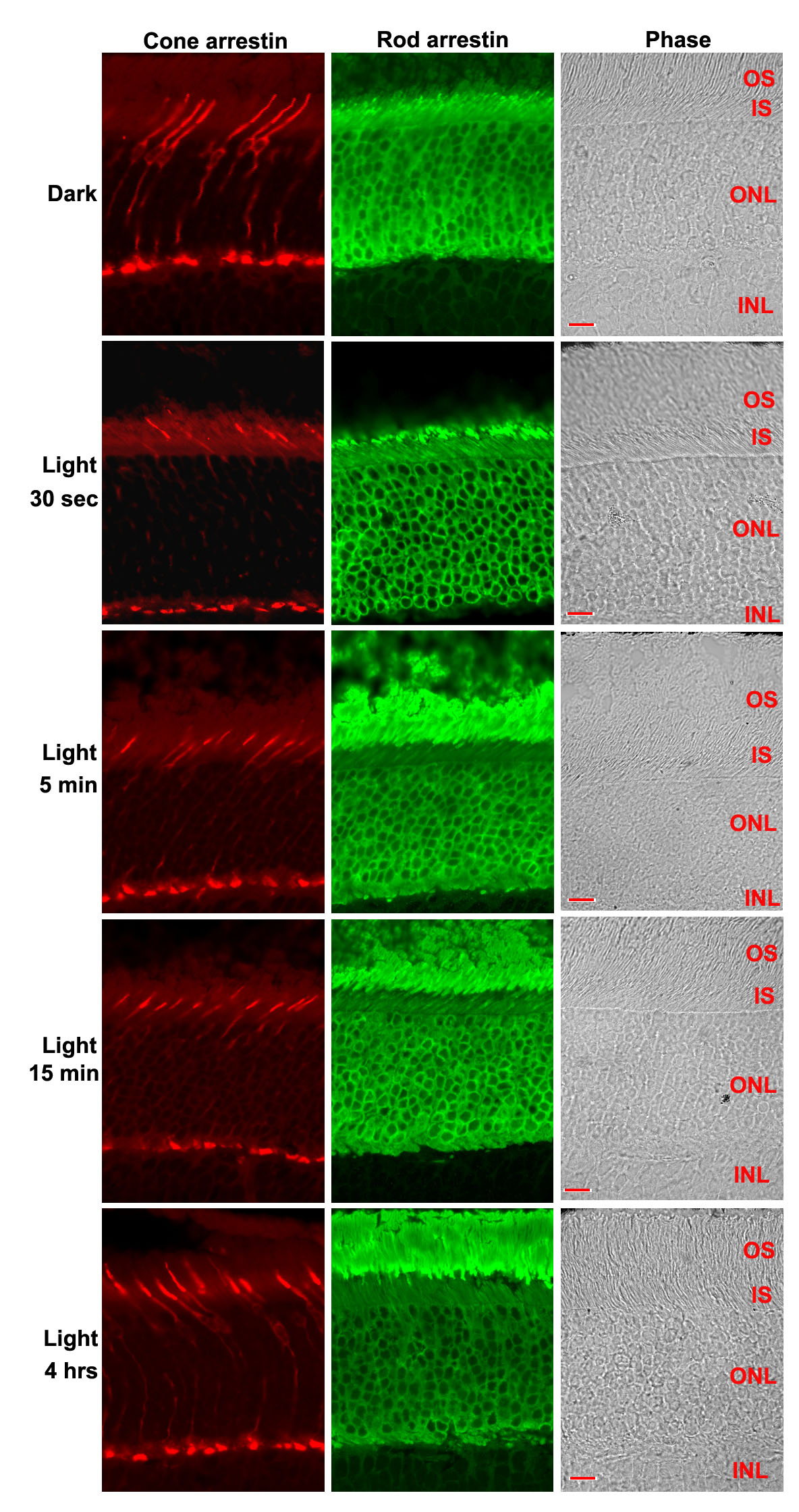 Adult C57Bl/6J mice were dark-adapted overnight (dark) and exposed to light for selected times before being killed, and the eyecups were immediately dissected and immersion-fixed in 4% paraformaldehyde. Frozen eyes were sectioned at 7 μm through the optic nerve. The sections were heated for 20 min in pre-heated 0.01% sodium citrate buffer (pH 6.0). After blocking, the sections were incubated with the anti-mouse cone arrestin polyclonal antibody LUMIJ (1:1,000) and the anti-rod arrestin monoclonal antibody C10C10 (1:10,000) and then with Texas Red-conjugated anti-rabbit IgG (1:100) and Fluorescin-conjugated anti-mouse IgG. After washing, the sections were examined and photographed as described in methods. OS, outer segments; IS, inner segments; ONL, outer nuclear layer; INL, inner nuclear layer. Bar represents 20 μm.