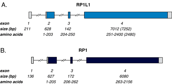 A: RP1L1 is composed of four exons, three of which (2-4) contain coding sequence. Exon 4 is of variable length, with minimum size shown and maximum size in parentheses. B: RP1 is also composed of four exons, three of which (2-4) contain coding sequence. RP1L1 and RP1 have similar genomic organization, especially the location of the intron/exon junctions.