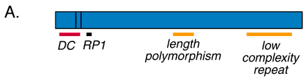 A: RP1L1 contains a region of homology to doublecortin (DC) and to RP1 (RP1). RP1L1 also contains a 16 amino acid polymorphism and large low complexity repeat. B: Comparison of the four shortest RP1L1 repeat polymorphisms. Repeat sequences are in red with an arrow depicted for each repeat. Sequence surrounding the repeats is very similar to that contained in one copy of the repeat. C: Partial alignment of human RP1L1 and RP1 protein sequences. The sequences corresponding to the doublecortin domains and RP1 domain are identified with bars. The asterisk ("*") represents identical amino acids and the period (".") represents similar amino acid residues.
