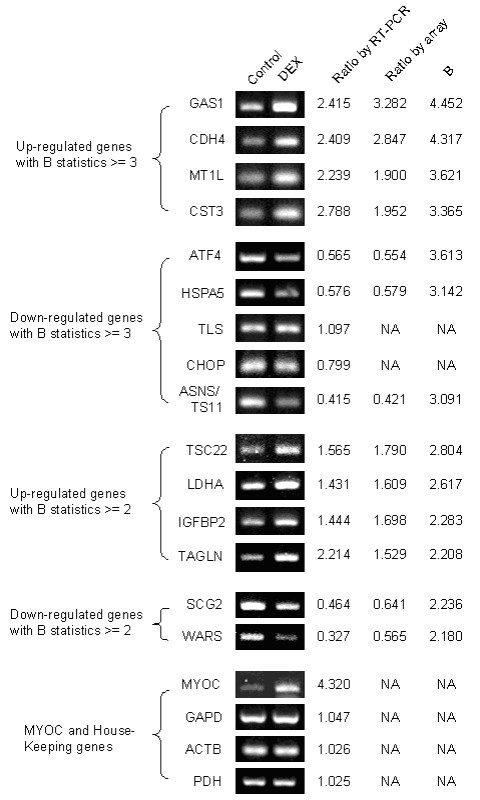 The differential expression of genes with B statistics >=2 and MYOC was confirmed by RT-PCR. Control: TM cells treated with water as control. DEX: TM cells treated with dexamethasone. NA: not available.