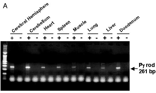 Figure 5. RT-PCR, RPA and western blot analyses of Pγ-rod expression in adult and embryonic rat tissues
