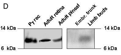 A: Total RNA (3 μg) from the indicated adult rat tissues was reverse transcribed, followed by 35 cycles PCR amplifications with Pγ-rod primers. Test reactions (+) were run in parallel with control reactions lacking reverse transcriptase (-). The reaction products (1/5 of the reaction) were analyzed by electrophoresis and visualized under UV light. Standard: 100 bp ladder (Promega). B: Total RNA (3 μg from trunk or limb buds of E13 rat embryos or 0.3 μg from adult rat pineal) was reverse transcribed, followed by 30 cycles PCR amplification with Pγ-rod primers. Test reactions (+), controls without reverse transcriptase (-). The reaction products (1/5 of the reaction) were analyzed as above. C: Aliquots of target RNA from the indicated tissues were hybridized with the Pγ-rod 35S-riboprobe and subjected to digestion with RNase A/T1. Samples were electrophoresed through 6% acrylamide / 6 M urea gel. The gel was dried and exposed 3 days to a PhosphoImager screen. Lane 1: polyA+ RNA (15 μg) from rat embryonic body (trunk+limb buds). Lane 2: total RNA (1 μg) from adult rat retina. Lane 3: yeast total RNA (50 μg). Lane 4: yeast total RNA (50 μg) without RNase. D: Protein extracts prepared as described in Experimental Procedures, were analyzed by SDS-PAGE and western blotted (retina 20 μg, pineal 20 μg, embryonic trunk 20 μg, limb buds 20 μg, recombinant Pγ 50 ng). The membranes were incubated with an antibody directed against the c-terminal region of Pγ-rod (1:15,000) and with an antibody directed against its N-terminal region (1:500). Immunoreactions were developped with peroxydase-coupled anti-rabbit (1:3000) and the enhanced chemiluminescence detection kit (Amersham).